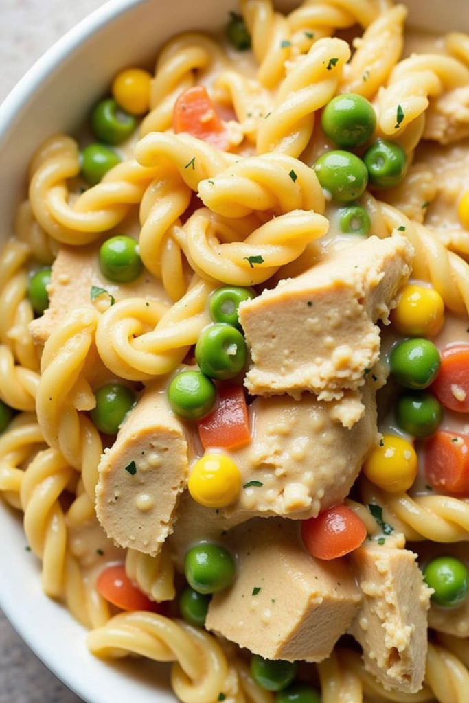 Once your pasta is al dente and drained, fold it into the creamy sauce. Add frozen peas for a burst of sweetness and color, then finish with a handful of chopped parsley. If you like, top everything with a sprinkle of grated cheese or crushed buttery crackers for a nod to the original pot pie’s signature topping. Serve hot and watch it quickly disappear!