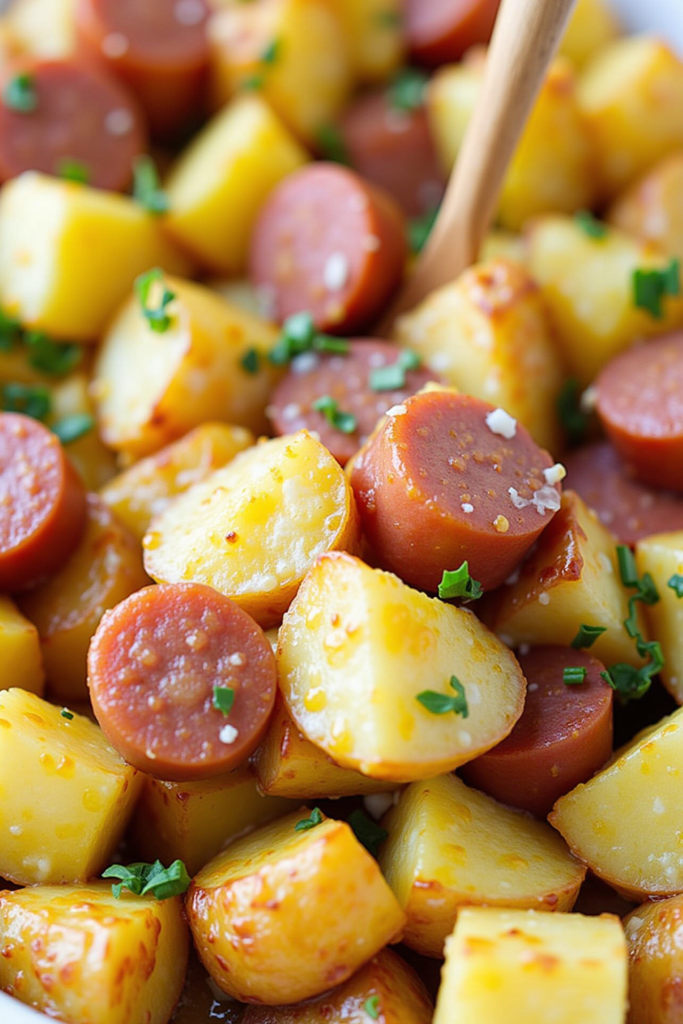 Choose a fully-cooked smoked sausage, sliced into bite-sized rounds. Roasting the sausage with the potatoes infuses the entire dish with an irresistible depth of flavor. Once the potatoes are tender and the sausages have caramelized edges, sprinkle shredded cheese over the top and return to the oven just long enough to melt the cheese into gooey, bubbling perfection.